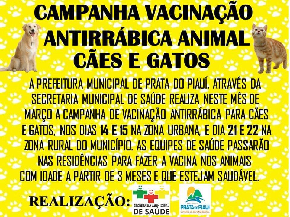 Campanha de vacinação contra raiva em cães e gatos estão sendo realizadas nos dias 14 e 15 de março na zona urbana de Prata do Piauí, e nos 21 e 22 na zona rural do município!