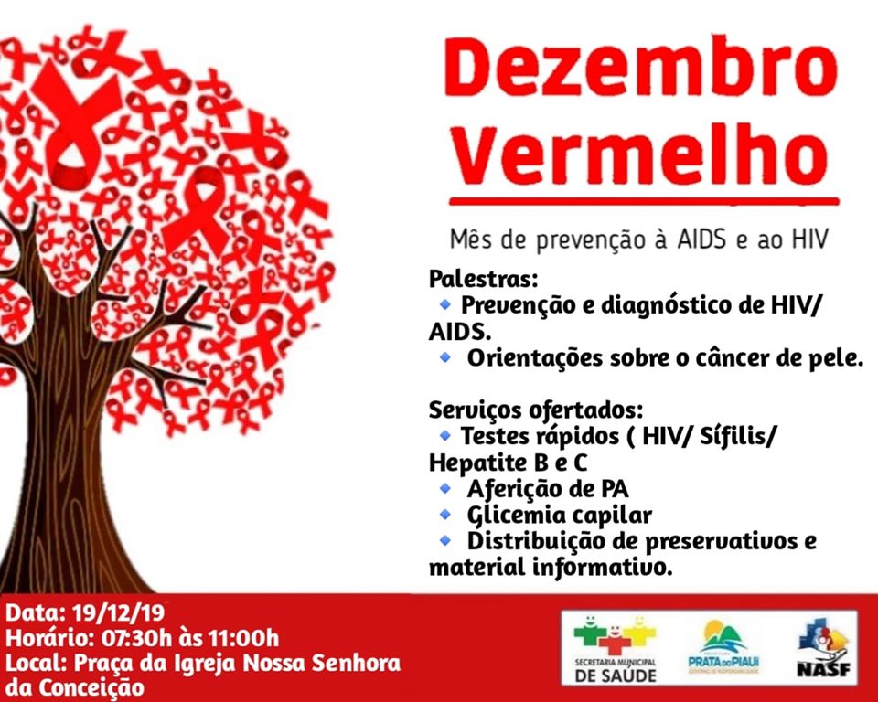 A Prefeitura Municipal de Prata do Piauí,através da Secretaria Municipal de Saúde,realizará amanhã 19/12, a campanha "Dezembro Vermelho". Tem o foco principal em jovens de 15 a 29 anos no combate ao HIV. Ação será realizada na praça da Igreja Nossa Senhora da Conceição. Às 7:30 às 11:h. da manhã ,venha e participe será aberto para toda população Pratense